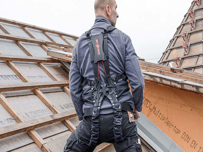 BionicBack ist eine effiziente Hebehilfe und unterstützt dauerhaft den Rücken und andere stark beanspruchte Körperpartien. Nach Untersuchungen an der ETH Zürich wird dadurch die Belastung der Wirbelsäule bei einem Gewicht von 20 kg um bis zu 24 Prozent reduziert. Zudem überzeugt die Innovation gegenüber anderen Exoskeletten durch das einfache An- und Ablegen und das geringe Gewicht. Der BionicBack kann unter der Arbeitskleidung getragen und bei Bedarf aktiviert werden. Damit ist das Exeosklett ideal für Arbeiten auf dem Dach und dem Gerüst.