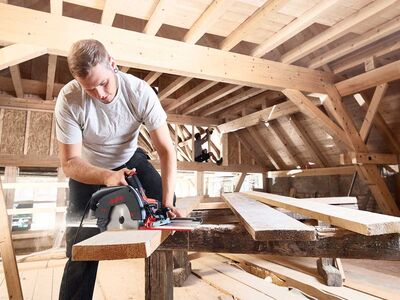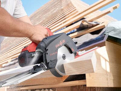 Der 1.800 Watt starke CUprex-Motor ermöglicht nun auch Kapp- und Gehrungsschnitte bei der Bearbeitung von Konstruktionsvollholz mit 60 mm Stärke und beim Zuschnitt von Dämmstoffplatten mit bis zu 60 mm Stärke. Vor allem bei Arbeiten auf dem Gerüst oder dem Dach reduziert das vergleichbar geringe Gewicht von 6,1 kg (6,6 kg KSS 60 36B) den Kraftaufwand gegenüber Maschinen mit größeren Schnitttiefen.