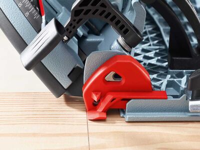 Die Maschine lässt sich schnell und einfach mit einer Rasttaste von der Schiene trennen. So gelingen auch Längs-, Schräg- und Tauchschnitte. Für Längsschnitte kann die Kreissäge mit dem praktischen Parallelanschlag und auf dem MAFELL Führungsschienensystem F und dem Saug-Spann-System Aerofix F-AF 1 geführt werden.