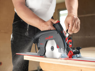 Für Längsschnitte können die beiden Kreissägen mit dem praktischen Parallelanschlag, dem Untergreifanschlag und auf dem MAFELL Führungsschienensystem F und dem Saug-Spann-System Aerofix F-AF geführt werden.