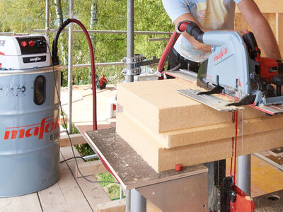 Bei der Bearbeitung von Holzfaserdämmstoffplatten sind bislang neben viel Staub auch große Mengen Holzfaserspäne entstanden, die zumeist nicht wirksam abgesaugt werden konnten. Die neue MAFELL Dämmstoff-Seilsäge wird an den leistungsstarken MAFELL Volumensauger S 200 angeschlossen, der an den zwei robusten Haltegriffen auch mit einem Kran auf das Gerüst gehoben werden kann. Der Volumensauger reduziert in sehr großem Umfang die Staubentwicklung und das Faservolumen. Die Impulstechnologie des Saugers und das große Fassungsvermögen von 200 l ermöglichen zudem einen nahezu unterbrechungsfreien Zuschnitt. Staub und Holzfasern werden in einem wiederverwendbaren Sack gesammelt.