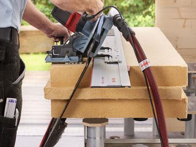 Weitere durchdachte Lösungen wie das Befestigungssystem F-Fix, um die Führungsschiene schnell auf der Dämmstoffplatte zu fixieren, oder die Maschinenhalterung, die am Absauggerät S 200 und am Gerüst zu montieren ist, erleichtern das Handling für den präzisen und sicheren Zuschnitt von Dämmstoffplatten auf dem Gerüst.
