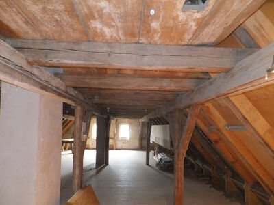 Durch den Einbau eines Sprengwerks in die Bestandskonstruktion konnte ein Stiel im Erdgeschoss entfernt werden, wodurch mehr Raum entstand. Dieser kann nun vielfältig genutzt werden. Ein Sprengwerk ist eine Holzkonstruktion, die dazu dient, Lasten, die von oben auf einen Punkt einwirken, seitlich von diesem wegzuleiten.