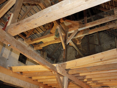 Neben der Sanierung des Kornhauses wurde der Dachstuhl des Wohnhauses umgebaut. Der bestehende Sparrendachstuhl wurde durch den Einbau einer Firstpfette (16 cm/28 cm) und zwei Mittelpfetten (20 cm/40 cm) in einen Pfettendachstuhl umgebaut, um dann eine Gaube zu bauen. Mit der MAFELL Kervenfräse ZK 115 Ec wurden die Klauen an den Gaubensparren ausgearbeitet. Zudem kam sie bei den Ausklinkungen für die Knaggen zum Einsatz.Die 20 m langen Pfetten wurden am Boden abgebunden und dann mithilfe eines Krans in den Dachstuhl gehoben.