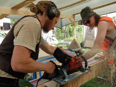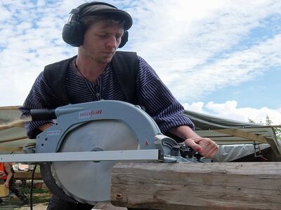 Da sowohl die Wandergesellen als auch die Projektverantwortlichen die Giebelwände als traditionelle Holzverbindung ausführen wollten, erleichterte der Kettenstemmer LS 103/40 Ec das Stemmen der vielen Zapflöcher ungemein. Die Zimmerei-Handkreissäge MKS 185 Ec wurde bei den mächtigen Holzquerschnitten von 18 x 18 cm gerne und häufig zum Ablängen und Auftrennen zur Hand genommen.